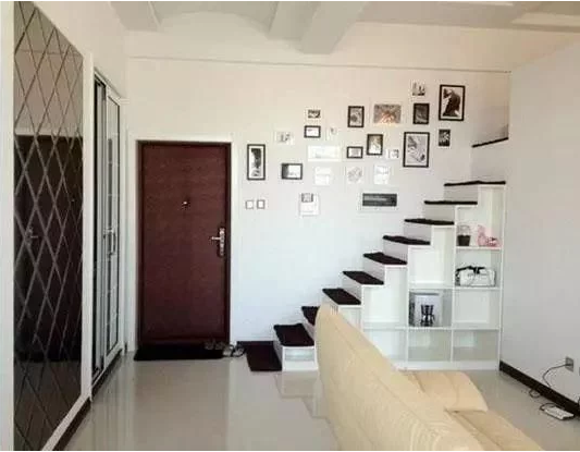 因为进门的玄关就是卫生间,所以我在楼梯的边上索性做了个收纳的小柜子,可以做收纳用,楼梯上挂了很多画,来装饰整个屋子。